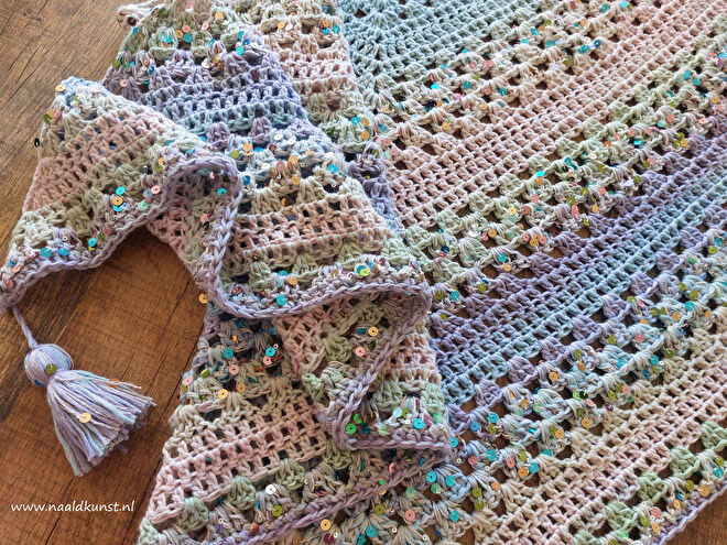 Je haakt met de Cotonella, dat is een zachte katoen met lang kleurverloop en af en toe haak je een paar rijen een dun draadje met grote en kleine pailletten mee. Hoe leuk!